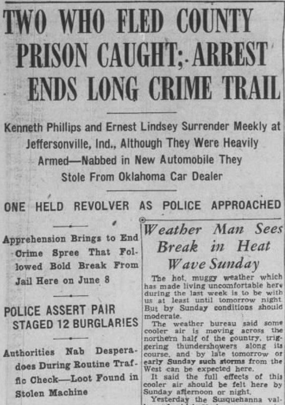 Kenneth Norman Phillips, 28, and Ernest Lynn Lindsay, 22, both of Harrisburg, were about three months into serving their nine-month sentences for burglary, larceny and receiving stolen goods. Both inmates had been on good behavior during their incarcerations. Phillips had notified the warden, J. Clyde Sweeney, that he wanted to give some personal items in his suitcase to Lindsay. The mens' personal items were stored in the warden's office, and both men were brought to the office around 7:00 p.m. by Deputy Omer A. Decker while the rest of the prisoners were on their evening recreation break. The prison received a phone call, and Warden Sweeney turned his back to the prisoners while he asnwered the call.